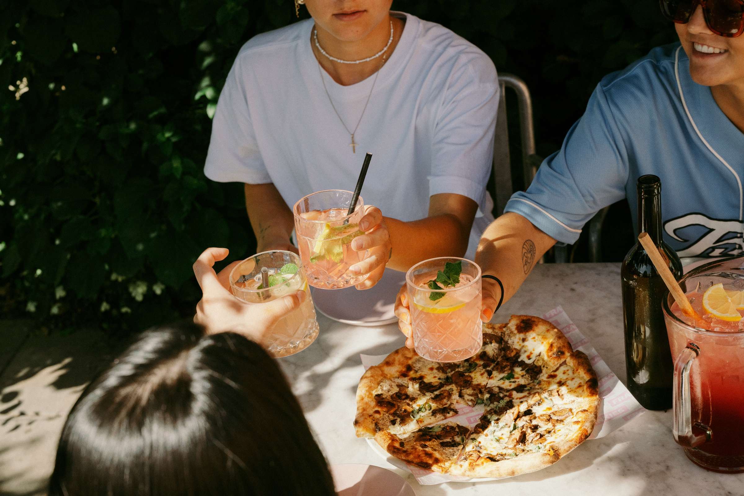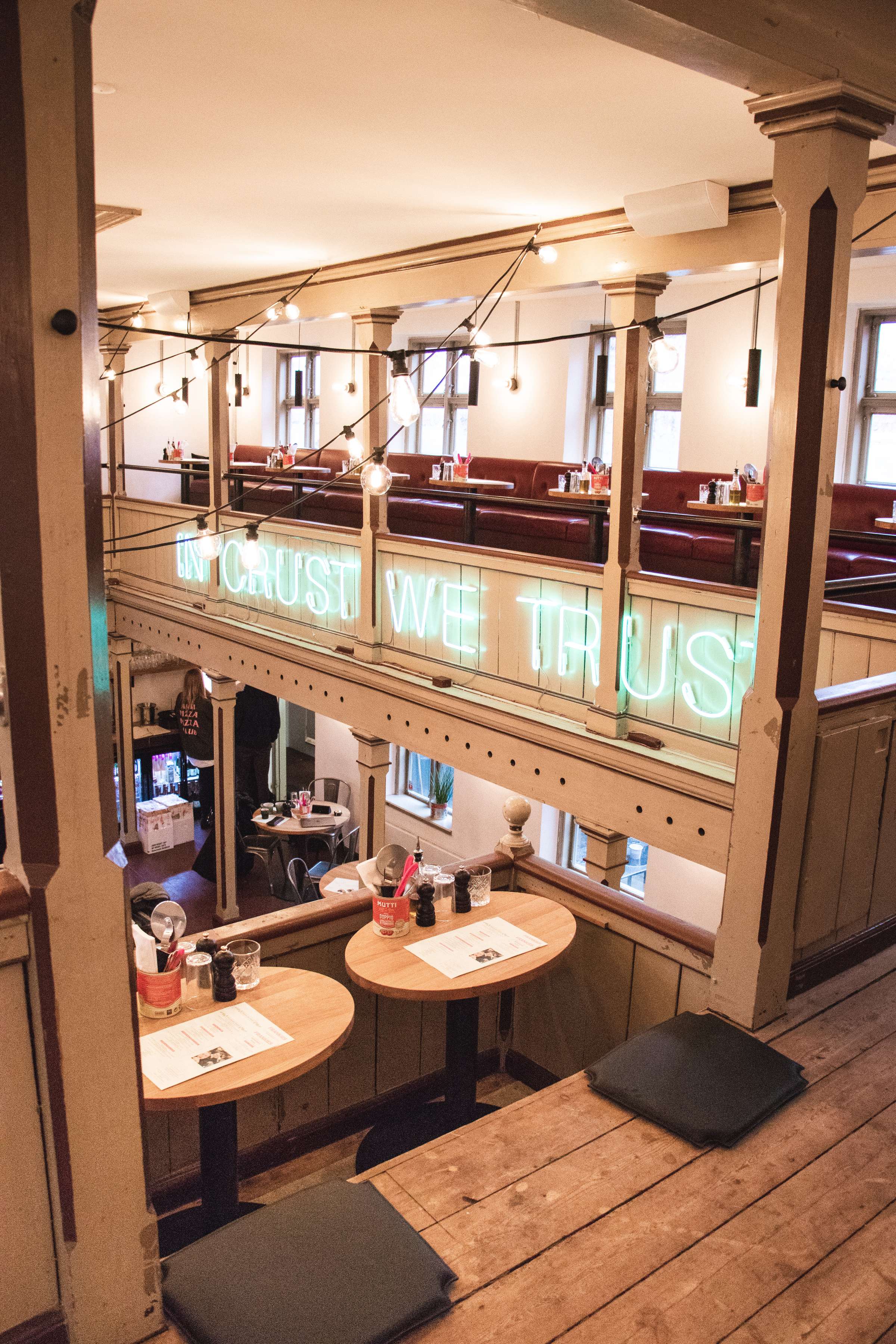 Indendørs har vi et rum, hvor den flotte balkon giver en eminent udsigt, uanset hvor du sidder, og udendørs er rammerne sat til hygge i solen med plads i både for- og baggård. Det er det perfekte sted at nyde vores lækre pizzaer, kolde drinks og en afslappet stemning, der indbyder til både hygge og fest.